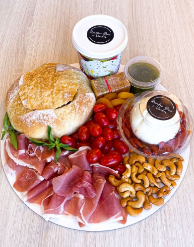 A Receber Bem & Vinhos apresenta o Combo de Burrata Prime, uma seleção gourmet que une sofisticação e frescor. A estrela do combo é a burrata envolta em pão italiano artesanal, acompanhada de presunto parma, tomates-cereja, molho pesto, castanhas, torradas especiais e uma manta recheada de mussarela com lombinho ou salame. Tudo isso montado com cuidado e charme, pronto para ser servido ou presenteado.