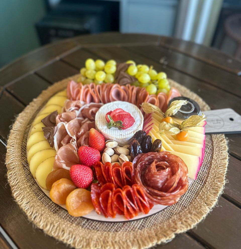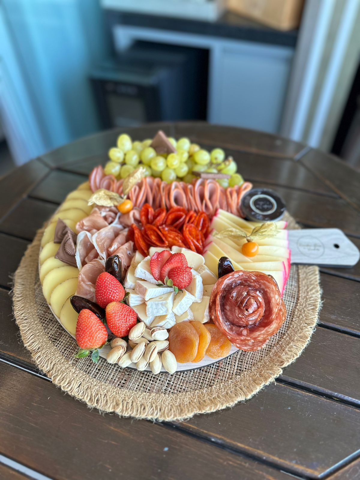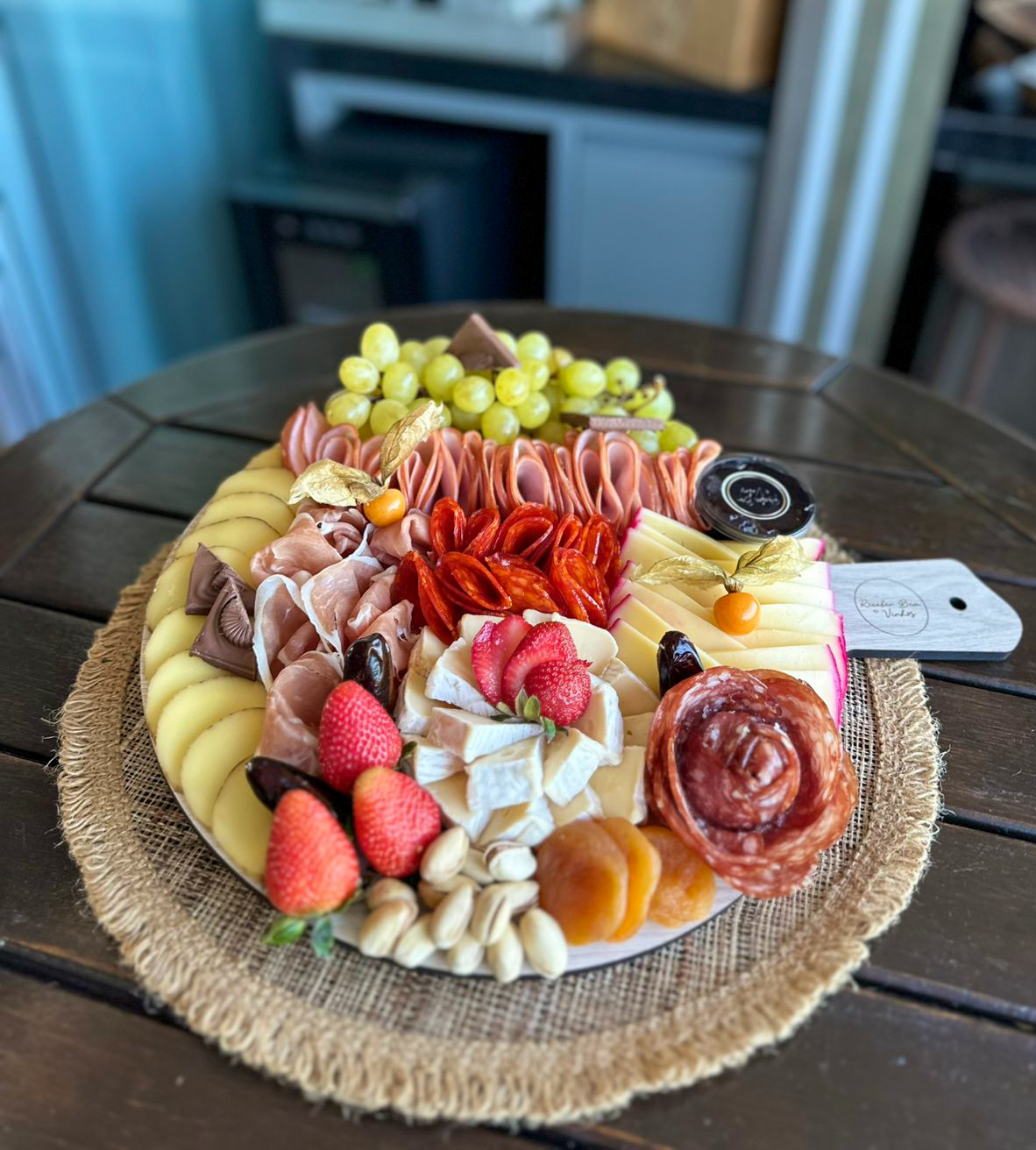 Compartilhe momentos com charme e sabor — a Tábua M para 4 pessoas é sofisticação em cada detalhe. Tabua com 30cm de diâmetro l. Não acompanha o vinho. Foto ilustrativa